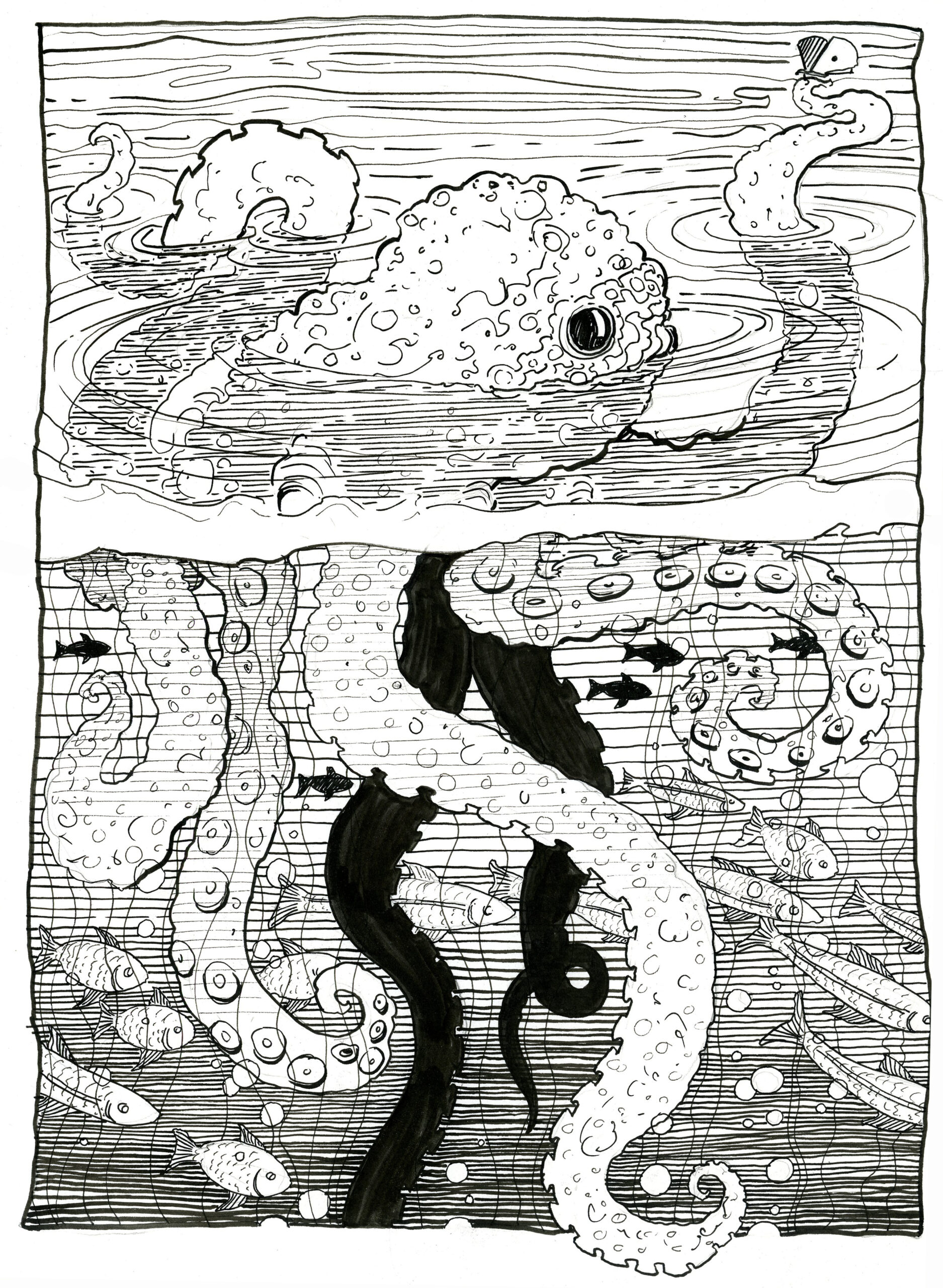 And I have been looking at how people draw water in cartoons (thanks again to Josh Bayer’s wonderful tutelage)–really a fantastic world of creating the illusion of things in black and white that I never really focused on before. And while I cannot hold a candle to Ms Celmins’ work, I have been having fun trying to make the illusion of water with my pen: